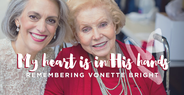 Nancy Leigh Demoss: This week we have the great privilege of hearing from the heart of one of my very favorite women. I've known Vonette Bright literally all of my life and she has been, oh, so much to me. She has been a mentor, a friend, a prayer partner, an encourager, almost a second mother. Her Husband was Dr. Bill Bright and together they founded Campus Crusade for Christ in 1951.
